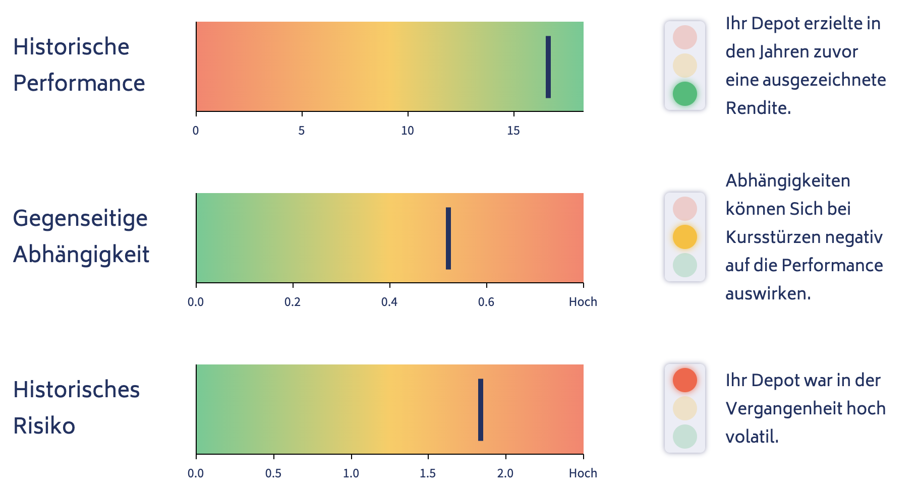 Zuoberst sehen Sie eine einfach verständliche Klassifizierung Ihres Depots nach den wichtigsten Kriterien. Rentablo verwendet ein einfaches Ampel-System, um Ihnen schnell Orientierung zu bieten. Sie sehen die Werte