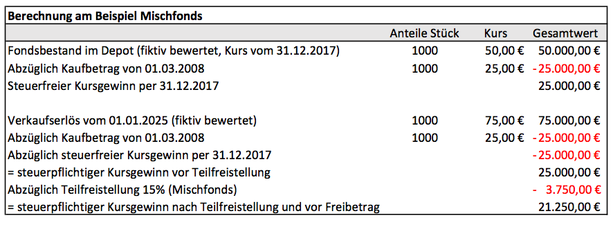 Als Ausgleich wird ein neuer Freibetrag eingeführt: Für bestandsgeschützte Alt-Anteile, die ab dem Jahr 2018 verkauft werden, bleibt ein Kursgewinn bis zu 100.000 Euro steuerfrei. Durch den fiktiven Verkauf am Jahresende 2017 bleibt der Wertzuwachs konserviert – auch wenn der Fonds erst in 15 Jahren verkauft wird, betrifft die Besteuerung die Zeit vor 2018 so wie bisher gehandhabt, wie das nachfolgende Rechenbeispiel zeigt: