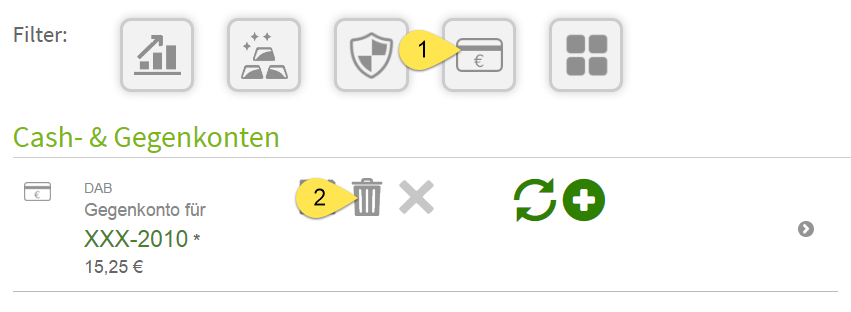 In der Liste deiner Cash- und Verrechnungskonten wird nun das DAB Verrechnunskonto angezeigt. Verwende das „Mülleimer“ Symbol (2) um alle zuvor importierten Transaktionen zu löschen.