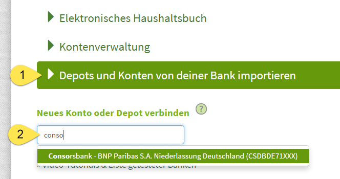 Nun weise das Consorsbank Verrechnungskonto (1) zu und wähle die Option „Mit manuell gepflegtem Depot verbinden“ (2).