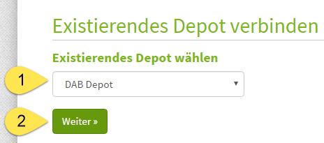 Im nachfolgenden Dialog, wähle bitte das bestehende DAB Depot (1) und klicke auf „Weiter“ (2).