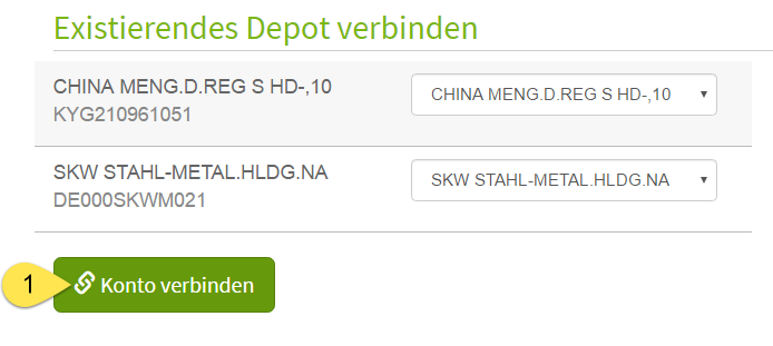 Nun werden die im Rentablo Depot befindlichen Wertpapiere mit den von der Consorsbank importierten Wertpapieren abgeglichen. Hierzu wird jedem im Rentablo Depot befindlichen Papier das entsprechende von der Consorsbank gelieferte Papier zugewiesen. Sollte es in der Liste Unstimmigkeiten geben, oder bestimmte Papiere nicht zugewiesen sein, so korrigiere die Zuweisung bitte von Hand. Klicke anschließend auf „Konto verbinden“ (1).