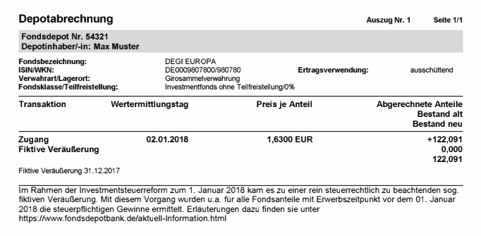 Bei anderen Depot-Banken wird das ebenfalls bis 31. Dezember 2020 passieren, sofern es noch nicht vorher erledigt wurde. Fondsvermittler wie Rentablo haben darauf keinen Einfluss. Davon betroffen sind alle Kunden, die Fondsanteile im Depot haben, welche vor dem 1. Januar 2018 angeschafft wurden. Ein Handlungsbedarf besteht deswegen aber nicht. Der Depotauszug könnte etwa so aussehen (Quelle: Fondsdepotbank):