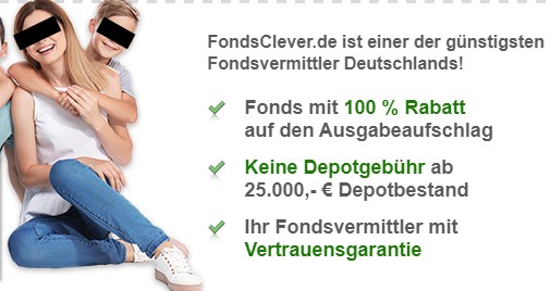 Ab einem Gesamtdepotvolumen von 25.000 Euro (ausgenommen ETF), so die Werbung, übernimmt der Fondsvermittler die Depot-Gebühren für den Anleger, also den Fondssparer. Wie wir schon öfter beschrieben haben, sollte sich ein wirklich cleverer Anleger davon nicht bluffen lassen. Denn über die einbehaltene Bestandsprovision zahlt der Kunde die Depotgebühren letztlich doch selbst.