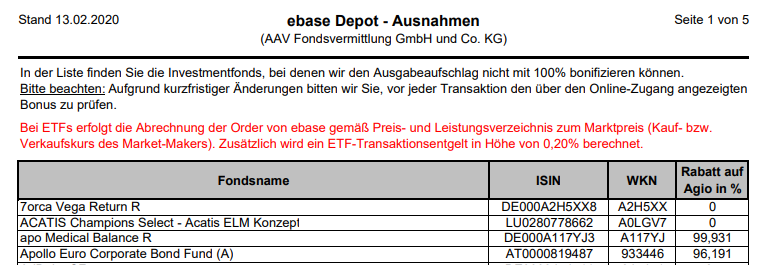 Die Anzahl der rabattierten Fonds ist nicht besonders groß im Vergleich mit anderen Fondsvermittlern, vor allem bei den Depotbanken ist die Auswahl sehr klein. Nur Ebase steht zur Verfügung.