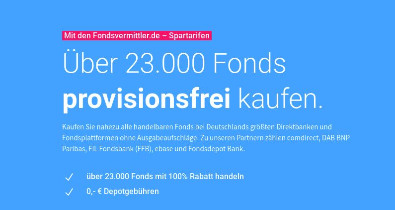 In großen Buchstaben empfängt Fondsvermittler.de die User mit der Botschaft, sie könnten hier über 23.000 Fonds provisionsfrei kaufen, und zwar bei comdirect, DAB BNP Paribas, FIL Fondsbank (FFB), ebase und Fondsdepot Bank. Von 0,- € Depotgebühren ist die Rede.