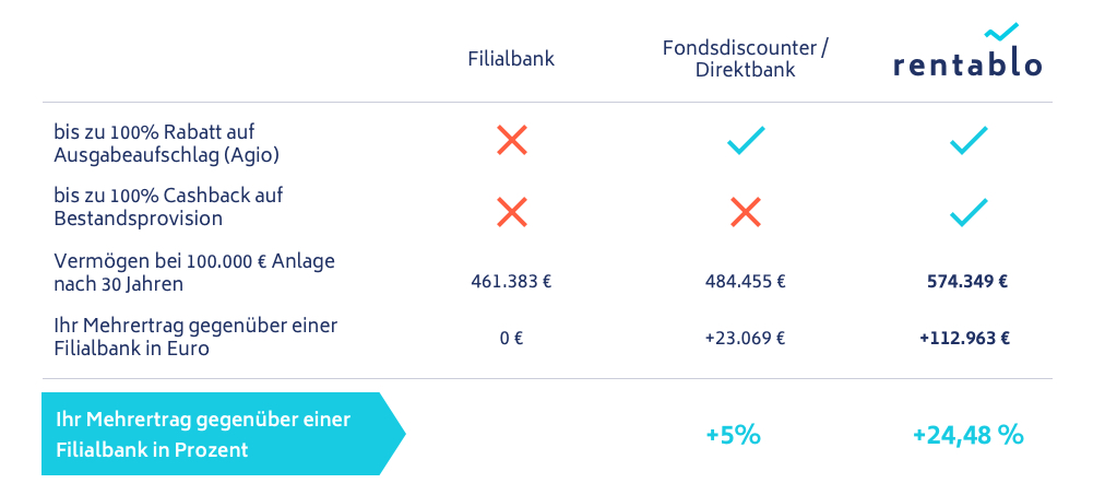 vielen Dank für Ihr Interesse am Rentablo Cashback. Sie können auf unserer Homepage http://www.rentablo.de in unserem Fonds-Provisionsrechner einsehen, wie viel Bestandsprovision bei dem Wertpapier ausgeschüttet werden. Die Ausschüttung variieren je nach Partnerbank. Zudem sehen Sie, wie viel Rabatt beim Ausgabeaufschlag gegeben werden kann.