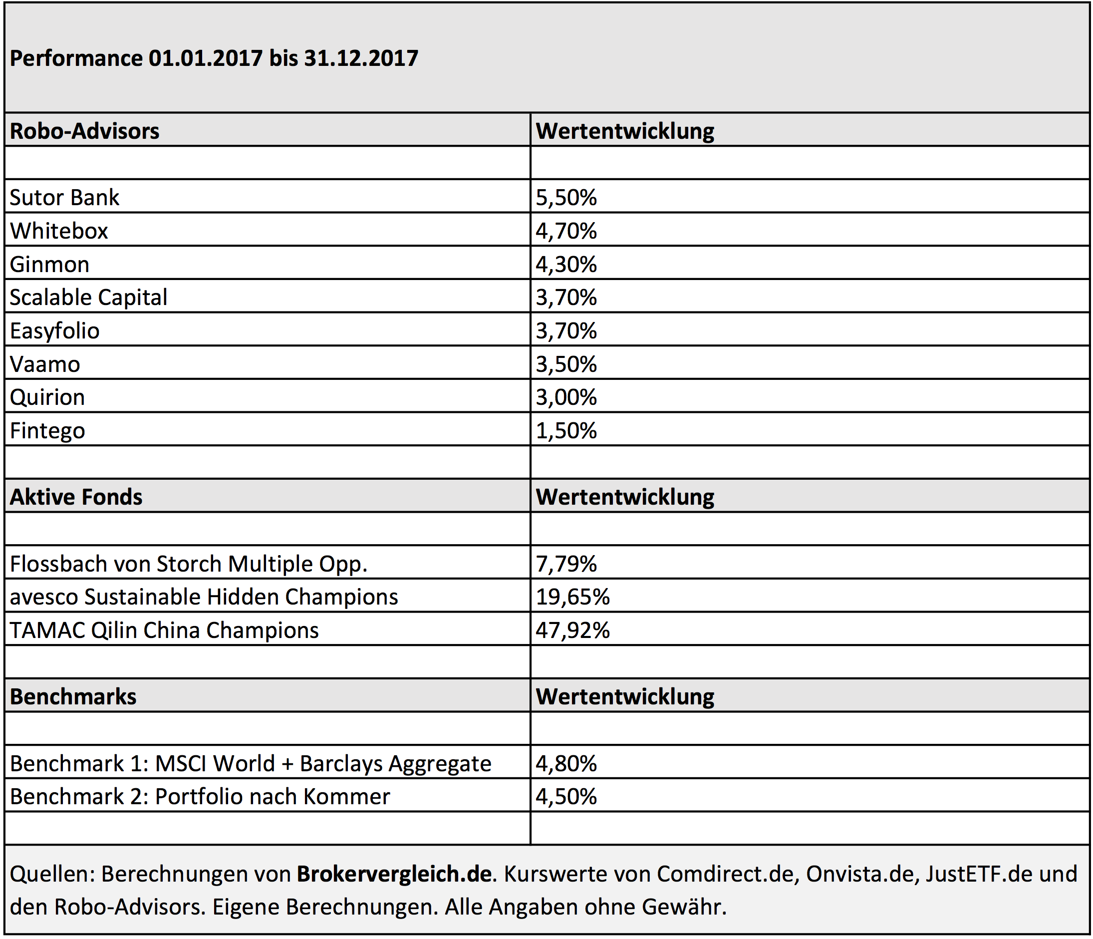 Ein abgeschlossenes Jahr bietet immer Anlass zu kompakten Rückblicken. Im Falle von Geldanlagen stehen besonders Performance-Daten im Fokus. Seit einigen Jahren sind sogenannte Robo-Advisors am Markt aktiv, die kostengünstige, automatisierte Anlagestrategien entwickeln. Nun liegen interessante erste Ergebnisse über das Abschneiden dieser Angebote vor. Die Kollegen von www.brokervergleich.de führen dankenswerterweise bereits seit drei Jahren einen entsprechenden Vergleich durch, den wir mit Daten von drei aktiv gemanagten Fonds angereichert haben.