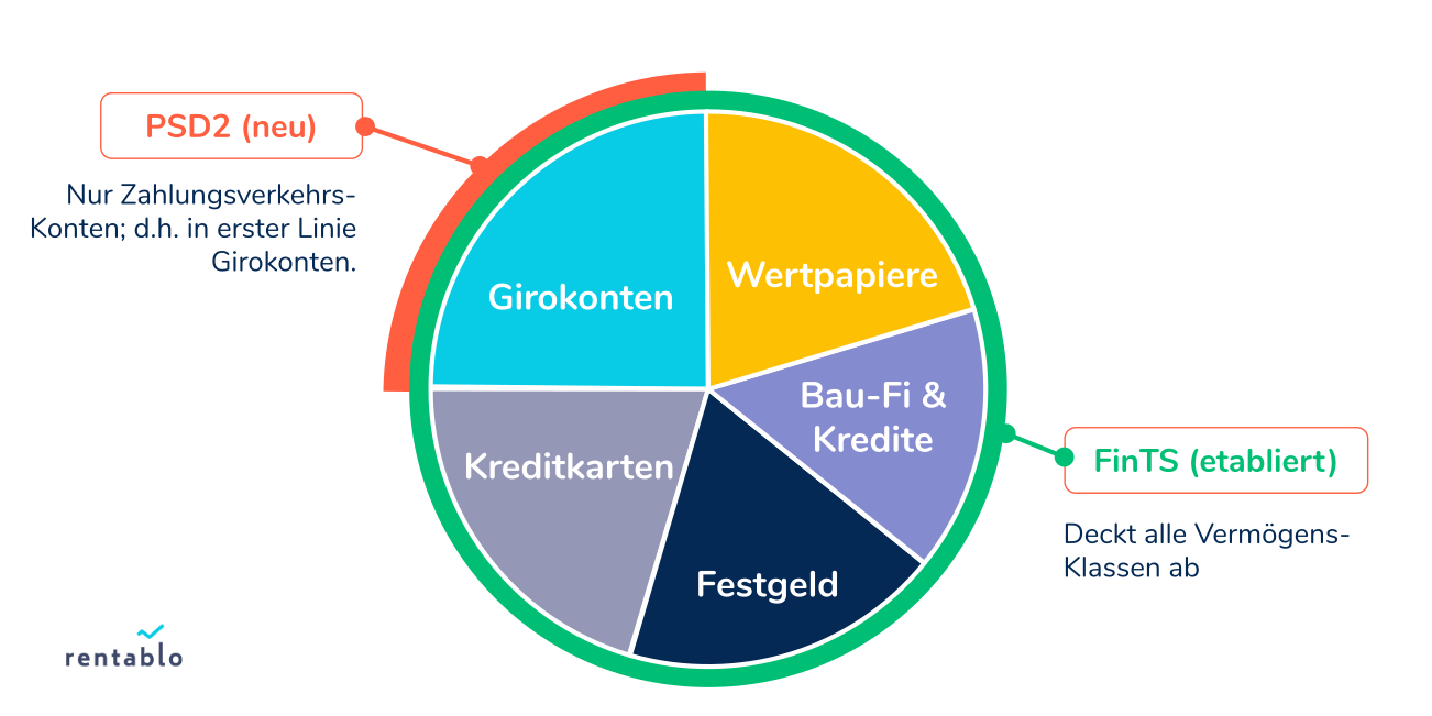 Kaum zu glauben aber wahr – Deutschlands Banken waren einmal Vorreiter bei der Digitalisierung. Aus dieser glorreichen Zeit stammt ein exzellentes Ökosystem an Bankschnittstellen; die zugrunde liegenden Standards werden HBCI und FinTS genannt. Über diese bestehenden Schnittstellen ist ein komfortabler Abruf von Konten, Transaktionen, Kreditkarten-Umsätzen und Wertpapier-Depots möglich. Sämtliche der mittlerweile verfügbaren aggregierenden Dienste (wie z.B. Rentablo oder Finanzguru) greifen auf die existierenden Schnittstellen zu.