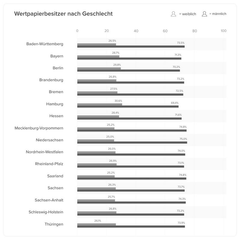 In allen Bundesländern ist der Anteil männlicher Anleger deutlich höher als der der Frauen. Im Schnitt war bei Consors im ersten Halbjahr nur jeder 4. Akien-Anleger eine Frau. Die höchste Frauenquote hatten die Bundesländer Hamburg, Berlin und Bayern. Am wenigsten vertreten waren Frauen unter den Aktienlegern in Niedersachsen. Über die Performance von Männern und Frauen wurden keine Angaben gemacht.