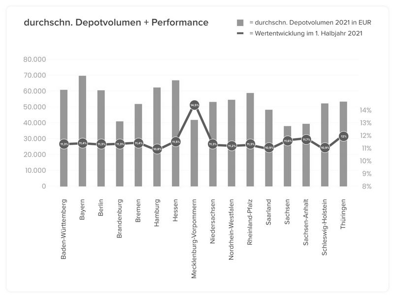Bei der Performance der Depots (ausgewertet wurde nur das 1. Halbjahr 2021) wird die Rangliste von vier ostdeutschen Bundesländern angeführt, ganz vorne mit einem Plus von 14,5 Prozent lagen Anleger aus Mecklenburg-Vorpommern. Allerdings muss man auch sagen, dass bei den anderen Bundesländern die Abstände eher gering sind: Die Performanca lag in einem Korridor von 10,9 bis 12 Prozent, im Schnitt etwa bei 11,5 Prozent (siehe Schaubild).