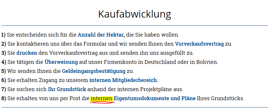 Allerdings liegt hier kein Kauf mit der Absicherung des Eigentums im Grundbuch vor, wie in Deutschland üblich. Es handelt sich lediglich um eine privatrechtliche Schuldverschreibung (internes Eigentumsdokument) der Firma „Zufluchtsort S.R.L. mit Sitz in Bolivien…