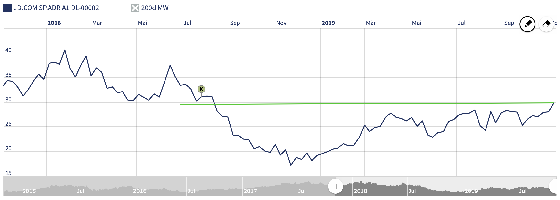 Habe ich mich für eine Aktie entschieden, so investiere ich mit einem langfristigen Horizont. Ist eine Position “unter Wasser”, so ist dies kein Grund gleich nervös zu werden. Schließlich investieren wir in Unternehmen in Wachstumsbranchen. Nach einiger Zeit sollte sich der Kurs daher wieder erholen. Ein schönes Beispiel ist hierbei mein Investment in den chinesischen Online-Händer JD.com. Nach einem Jahr des Leidens hat sich der Kurs aufgrund ausgezeichneter Wachstums-Perspektiven wieder erholt.