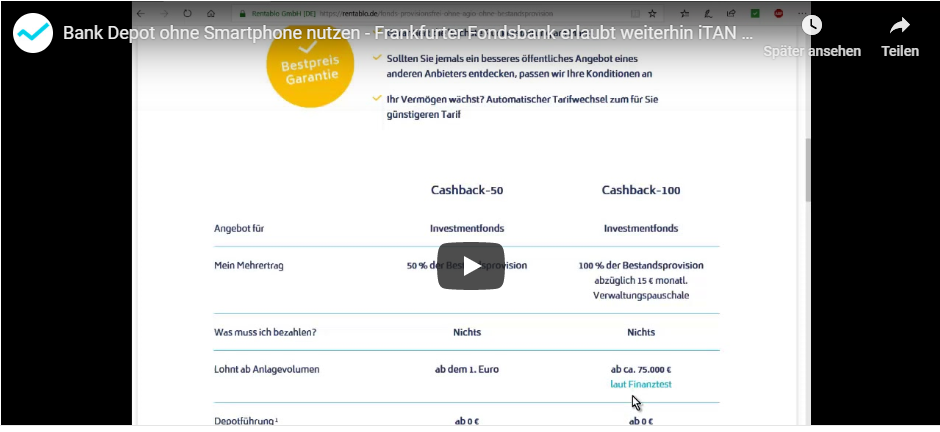 Zum einen gibt es bei der Frankfurter Fondsbank (FFB) weiterhin die TAN auf Papier (iTAN) und als Alternative die sms-TAN. Für die iTAN benötigen Sie kein Handy und für die smsTAN reicht ein Handy, mit dem Sie eine SMS empfangen können. Zum anderen zahlen Sie über Rentablo keine Ausgabeaufschläge und erhalten die sogenannten Kickback-Zahlungen als Cashback direkt auf Ihr Konto.