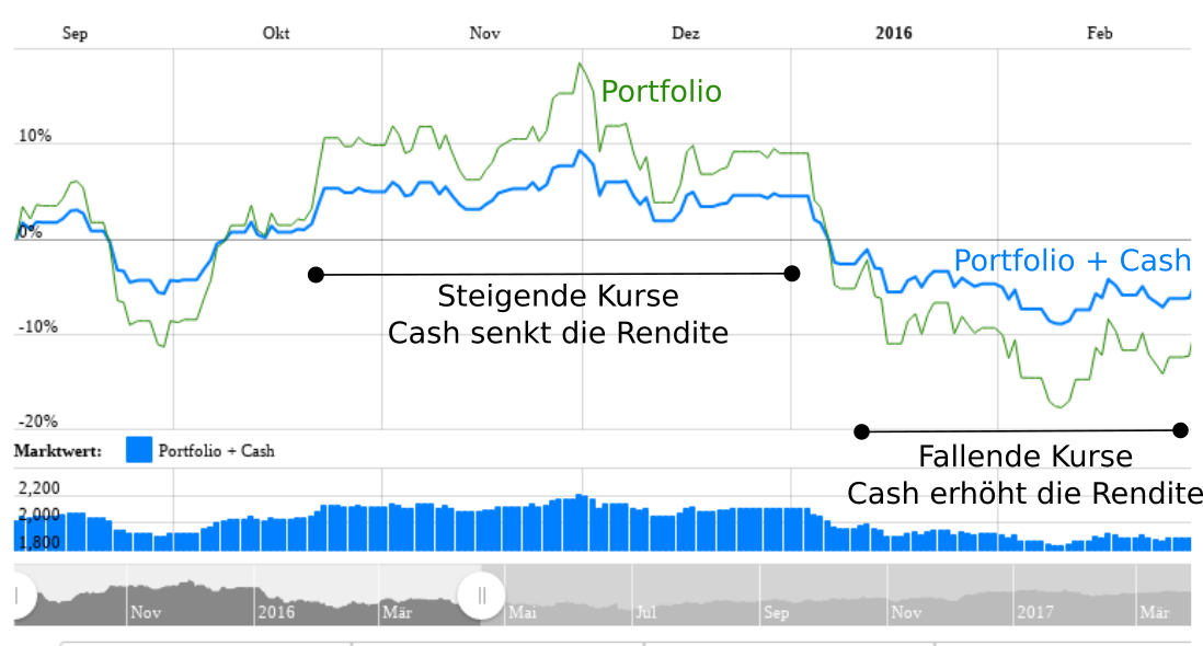 Cash-Positionen werden bei Renditevergleichen gerne vergessen. Allerdings werden erfahrene Anleger vor guten Marktphasen Cash abbauen und vor schlechten Phasen Cash aufbauen. Dies hat einen erheblichen Effekt auf die tatsächlich erzielte Rendite. Rentablo berücksichtigt daher bei der Berechnung nicht nur das Wertpapier-Portfolio, sondern auch das Cash-Konto, auf dem die Wertpapier-Transaktionen verrechnet werden. Die nachfolgende Grafik veranschaulicht den Effekt.