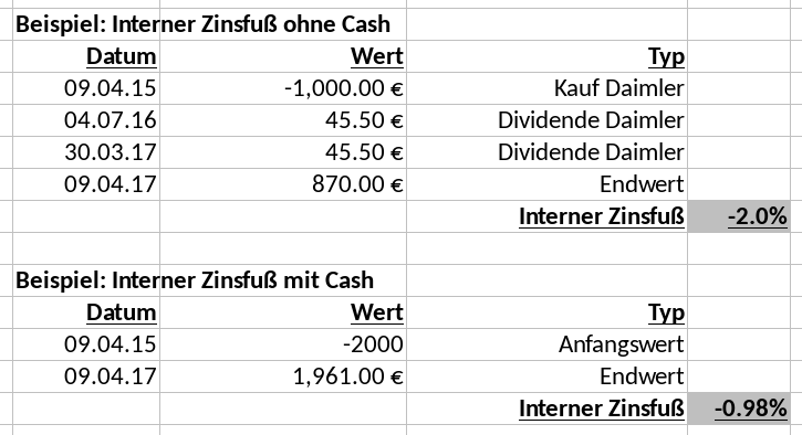 Ein Anleger hat am 04.09.2015 für 1.000 Euro Daimler-Aktien gekauft. Seither warf das Investment 91 EUR Dividenden ab; der Kurswert des Portfolios beträgt am 04.09.2017 870,00 EUR. Die annualisierte Rendite beträgt hier nach dem Internen Zinsfuß -2,0%. Wenn der Daimler-Anleger zusätzlich noch 1.000 EUR Cash hält, so verbessert sich seine Rendite auf -0,98%.