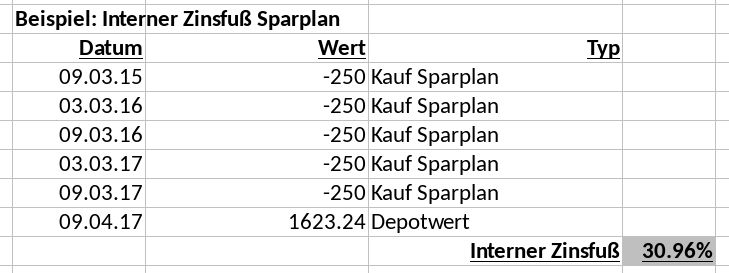 Hierbei wird die Zeitgewichtung anschaulich. Bis zum 09.04.2017 hat die Anlegerin insgesamt 1.250 € investiert; der aktuelle Wert beträgt 1.623 €. An reinen Kursgewinnen ergeben sich also 373 € oder 29,84 %; dies wären dann grob 15 % pro Jahr. Der Interne Zinsfuß beträgt aber 30,96 % pro Jahr.